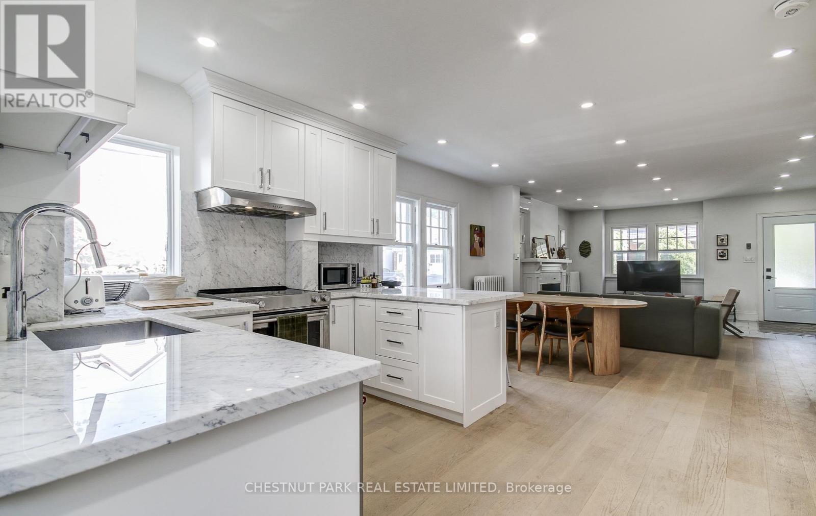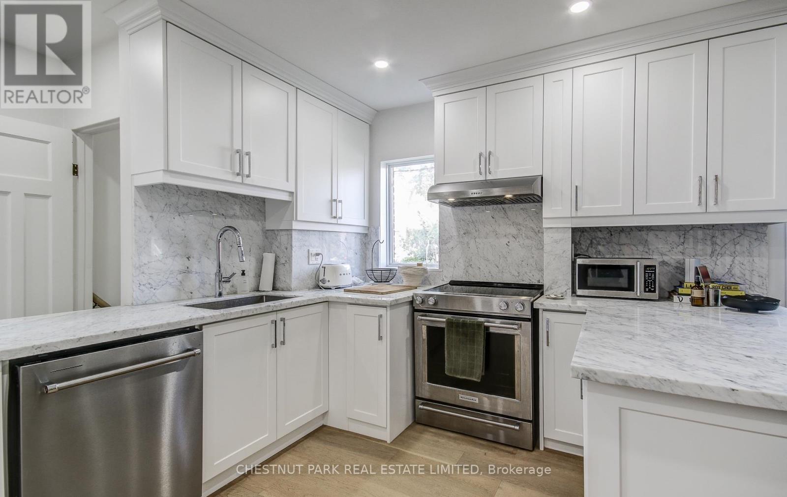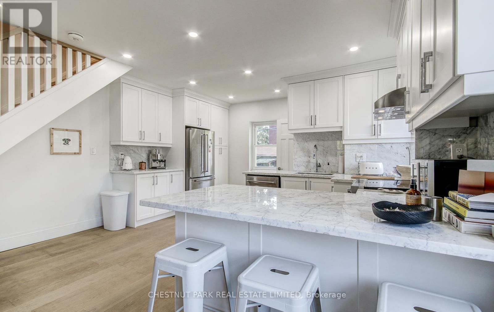 Fantastic opportunity to live in this beautifully renovated home! Open concept and spacious main floor with tons of natural light and white oak hardwood. Kitchen features KitchenAid appliances, Carrara marble, tons of storage, and breakfast bar. Upstairs are 2 bedrooms and a 4-piece bath. Lower level with large laundry room with built-in storage, 4-piece bath, recreation room. Private, fenced backyard, and garage with 1 parking spot. Steps to Donlands TTC, and Danforth shops, restaurants, parks, and schools. Use of 1 parking space within garage. (id:18750)